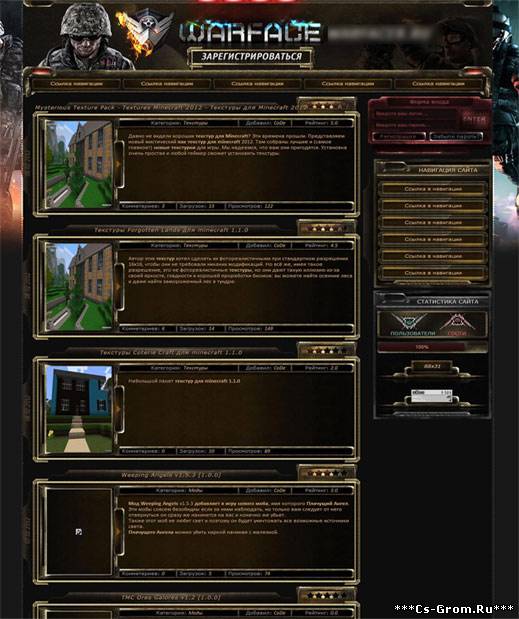 Для данной темы (Варфейс) до сегодняшнего дня, небыло практически ни одного шаблона.Но вот, время прошло, и появился нормальный, рентабельный шаблон на тему варфейс (warface), для тех людей, которые до сих пор не могут найти приличный шаблон для юкоза данной тематики.Вместо 2-х блоков (левого и правого)- для удобства пользования сайтом сделан только один, но, для тех кто привык к 2-м блокам, за место него сделано отличное горизонтальное меню, и в нём- можно разместить любые пункты меню.