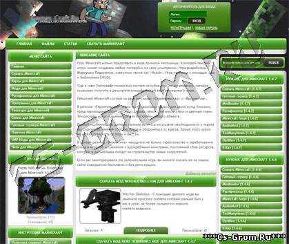 Диз сайта выполнен в стиле самой игры майнкрафт:все блоки, виды материалов, ну и конечно же шапка- всё точь-в-точь как в игре.И если Вы, старались найти подходящий вам шаблон для майнкрафт сайта- то ваши поиски не напрасны, этот шаблон у Вас перед глазами! Поставив его на свой сайт, Вы никогда не пожалеете о этом: все посетители будут долго держаться на сайте.